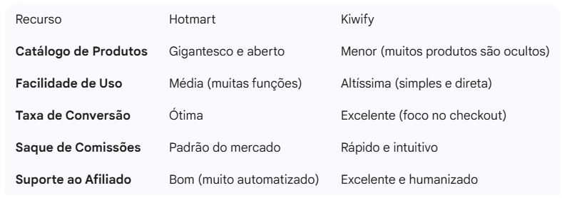 Dica de Ouro: Você não precisa escolher apenas uma! Muitos afiliados profissionais usam a Hotmart para seus projetos de autoridade e a Kiwify para suas ofertas de tráfego direto.